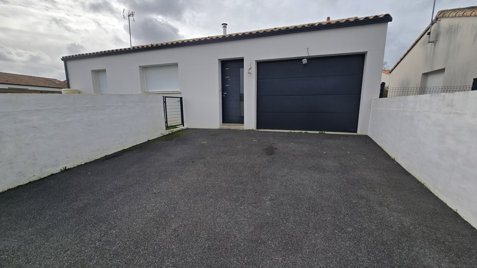 Maison de plain pied offrant une grande pièce de vie avec une cuisine aménagée ouverte. La maison comprend également un espace nuit de deux chambres, une salle d’eau, un WC séparé, ainsi qu’un garage offrant la possiblité de nombreux rangements.